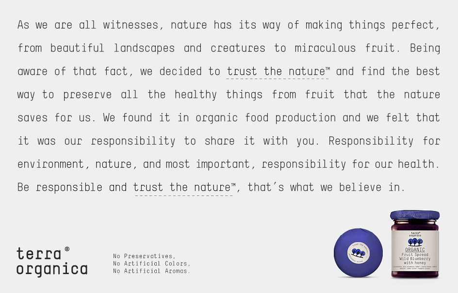Another gem we are proud of is the new design for organic line of products called Terra Organica® from the Serbian food company FOODLAND. Our work here includes slogan, brand itentity and label design.
