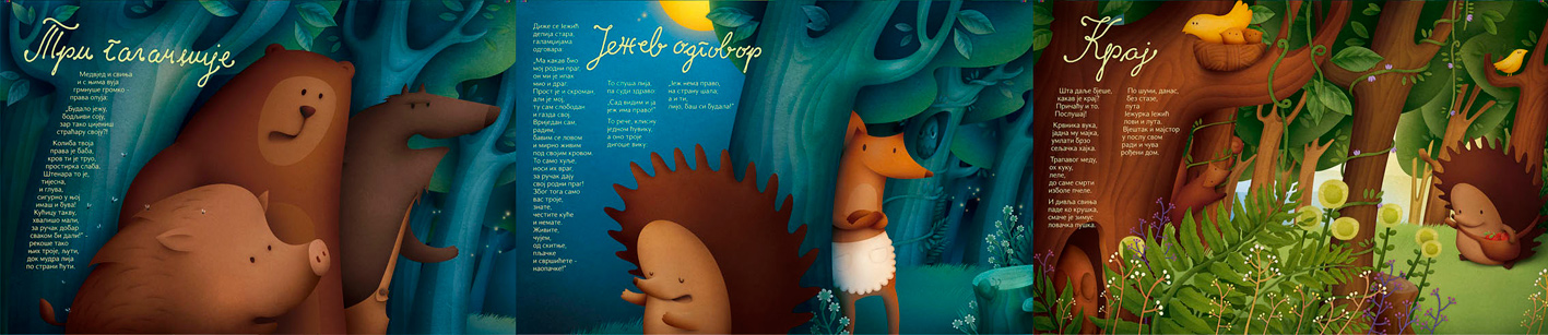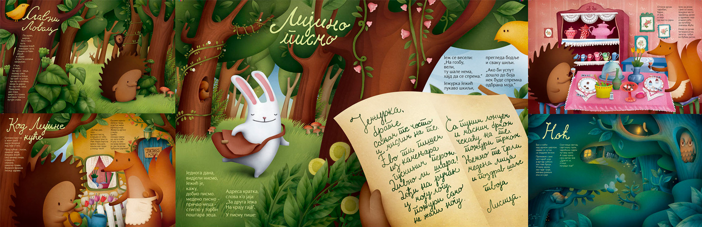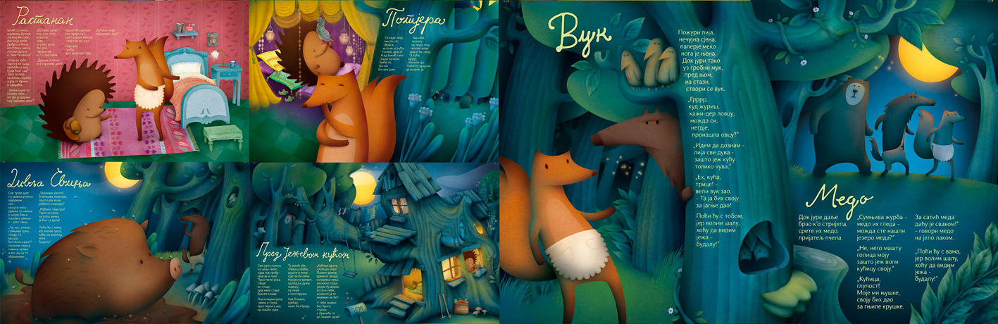 llustrations for Branko Ćopić’s famous children book JEŽEVA KUĆICA or HEDGEHOG’S HOUSE, which was published by Montenegrin publisher TOBOGAN and introduced at the 2010 Belgrade Book Fair. Although our Art Director Marijana Zaric did most of the work, the entire PGS was taken back to their childhood for a moment. It’s nice to have projects like this one. Book has hard cover with 13 full color illustrated spreads (28 pages). Illustration done by: Marijana Zaric & Viktorija Cikos. |